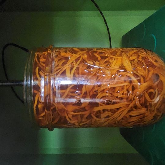 Cordyceps Militaris Tincture made from our Fresh, Organic Cordyceps Militaris Mushrooms. We only use our Fruiting Bodies - No Mycelium or Fillers. We use a 9 week process which includes an alcohol extraction and a warm water extraction each followed by ultrasound to enhance the yield of the beneficial polysaccharides. We do not use a hot water extraction as temperatures over 165F will damage polysaccharides. Tinctures are the easiest way to incorporate Cordyceps into your diet as they can be taken directly or in a liquid. Instructions on the container provide standard dosage and the 2 ounce size can last up to 2 months taken once per day. Health Benefits of Cordyceps Militaris may include Energy & Stamina Boost, Immunity System Boost, Cognitive Function Improvement, Anti-Aging, Respiratory Health and Edema Relief. Those with Auto-Immune Issues or are Pregnant or Nursing should consult with a health expert before using. Net weight 2 ounces. Note: Potential Health Benefits have not been fully verified by the FDA.